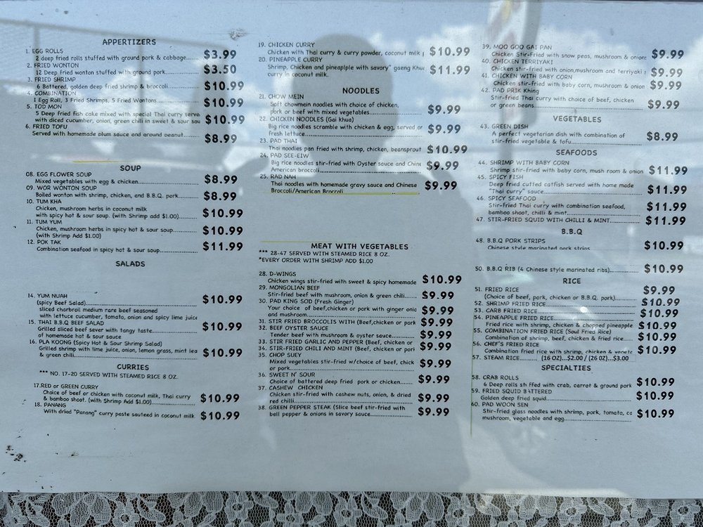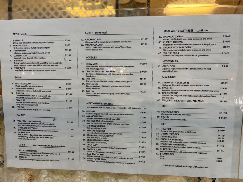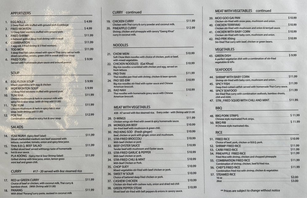 From the spicy Yum Nuah beef salad to the savory Mongolian beef with a hint of sweetness, each plate delivers a taste of authenticity. The chef's fried rice is a crowd favorite, blending shrimp, chicken, and fresh vegetables into a comforting bowl.