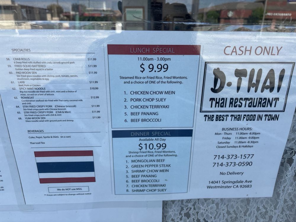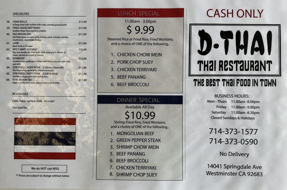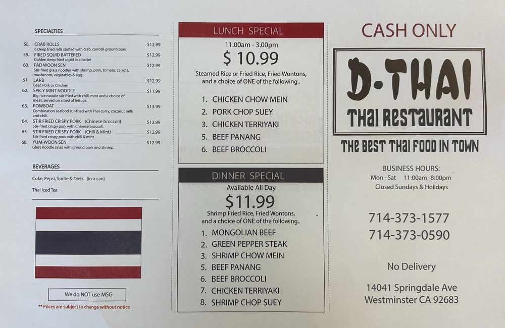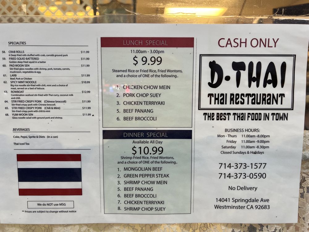 Welcome to D Thai Chinese Restaurant, a hidden gem in Westminster, California, where culinary tradition meets vibrant flavors. Specializing in both Thai and Chinese fare, this restaurant offers a delightful array of dishes that cater to all palates, including many vegetarian options.